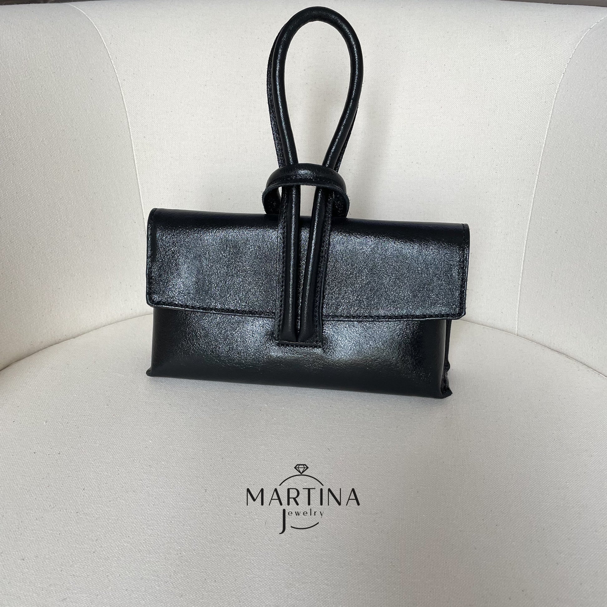 Borsa in vera pelle con cinturino da polso e chiusura a nodo. Tracolla rimovibile e regolabile, apertura a ribalta.